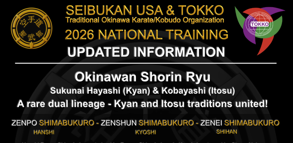 SEIBUKAN USA AND TOKKO PRESENT 2026 NATIONAL TRAINING WITH HANSHI ZENPO SHIMABUKURO, KYOSHI ZENSHU SHIMABUKURO AND SHIHAN ZENEI SHIMABUKURO. REGISTER AT SEIBUKANUSA/EVENTS